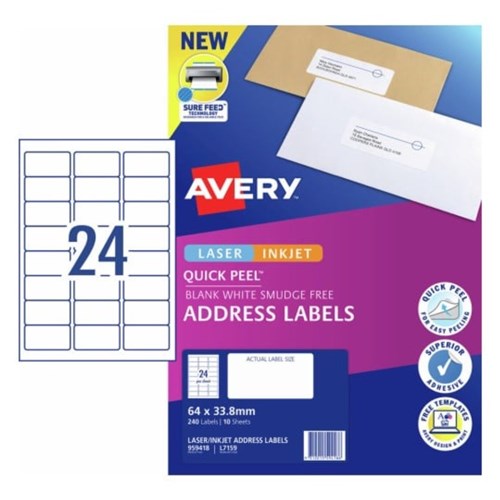 Avery Address Labels L7159 24UP Quick Peel 64 x 33.8mm White 240 Labels 10 Sheets