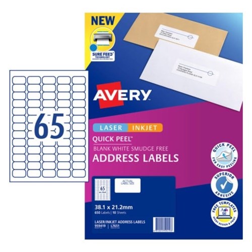 Avery Address Labels L7651 65UP Quick Peel 38.1 x 21.2mm White 650 Labels 10 Sheets