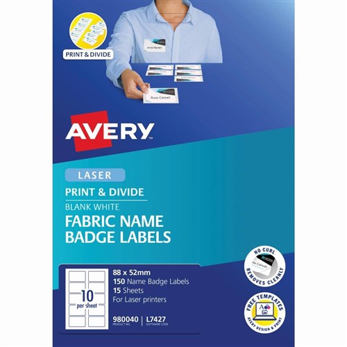 Avery Fabric Print & Divide Name Badge Laser Labels L7427 88x52mm 10UP, 15 Sheets