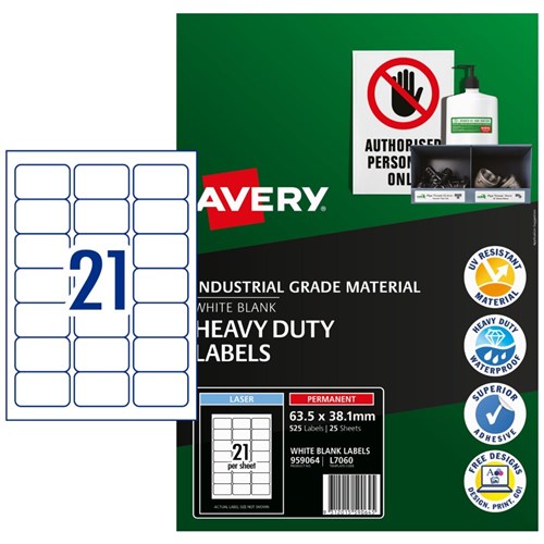 Avery Heavy Duty Laser Labels L7060 63.5x38.1mm White 21UP 25 Sheets