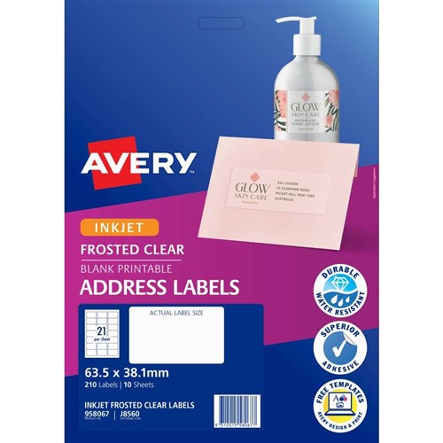 Avery Inkjet Frosted Clear Label 21UP 63.5x38.1mm 210 Labels, 10 Sheets