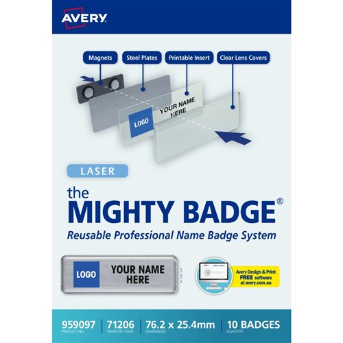 Avery Mighty Badge System For Laser Printer 71206 76.2 x 25.4mm Set Of 10 Silver