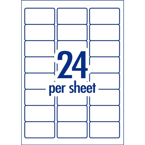 Size: 64 x 33.8mm, 1200 labels, 50 sheets, 24 labels per sheet (24UP).