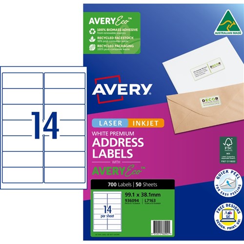 Avery Premium Address Labels White Laser Inkjet AveryEco L7163 99.1x38.1mm 14UP 700 Lab