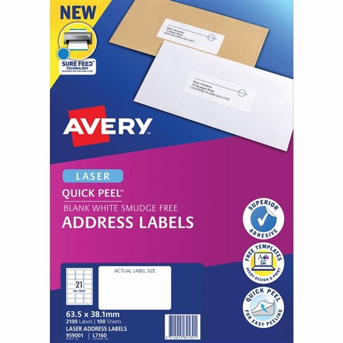 Avery Quick Peel Address Laser Labels L7160 63.5x38.1mm White 21UP, 20 Sheets
