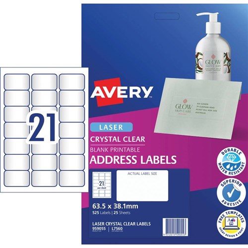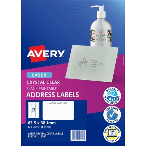 Avery Quick Peel Address Laser Labels L7560 63.5x38.1 Crystal Clear 21UP, 25 Sheets