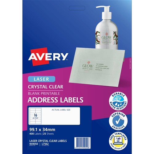 Avery Quick Peel Address Laser Labels L7562 99.1x33.9 Crystal Clear 16UP, 25 Sheets