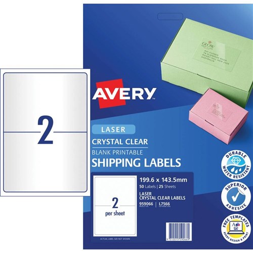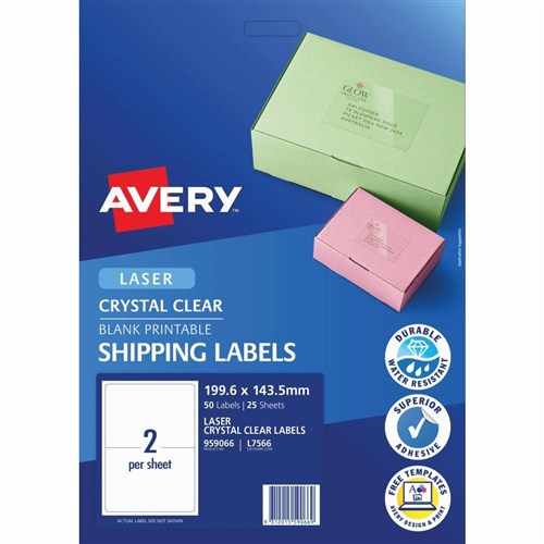 Avery Shipping Laser Labels L7566 199.1x143.5mm Crystal Clear 2UP 25 Sheets
