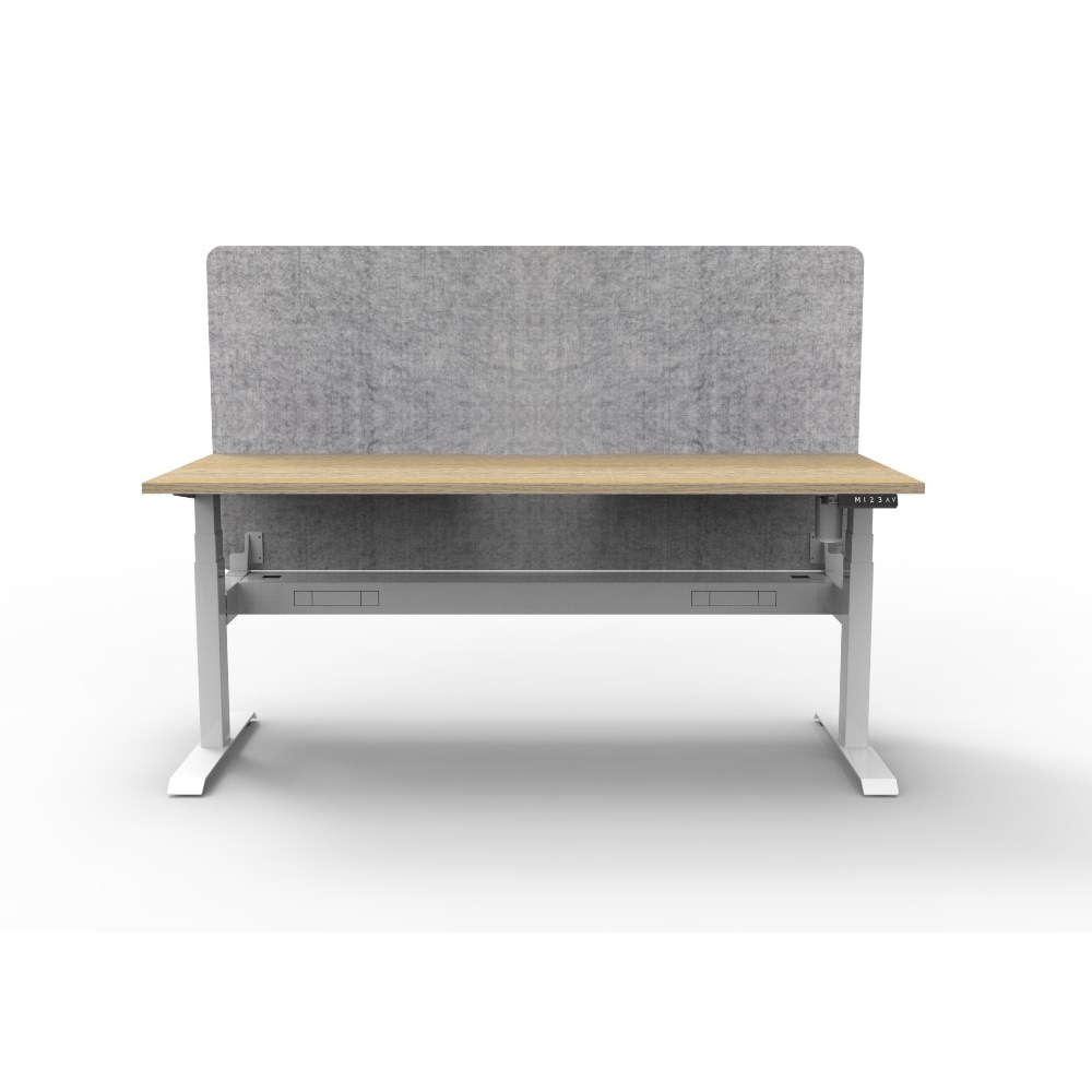 Electric height adjustable single sided workstation with Natural Oak top and White Satin frame, Grey Eco screen and cable tray.