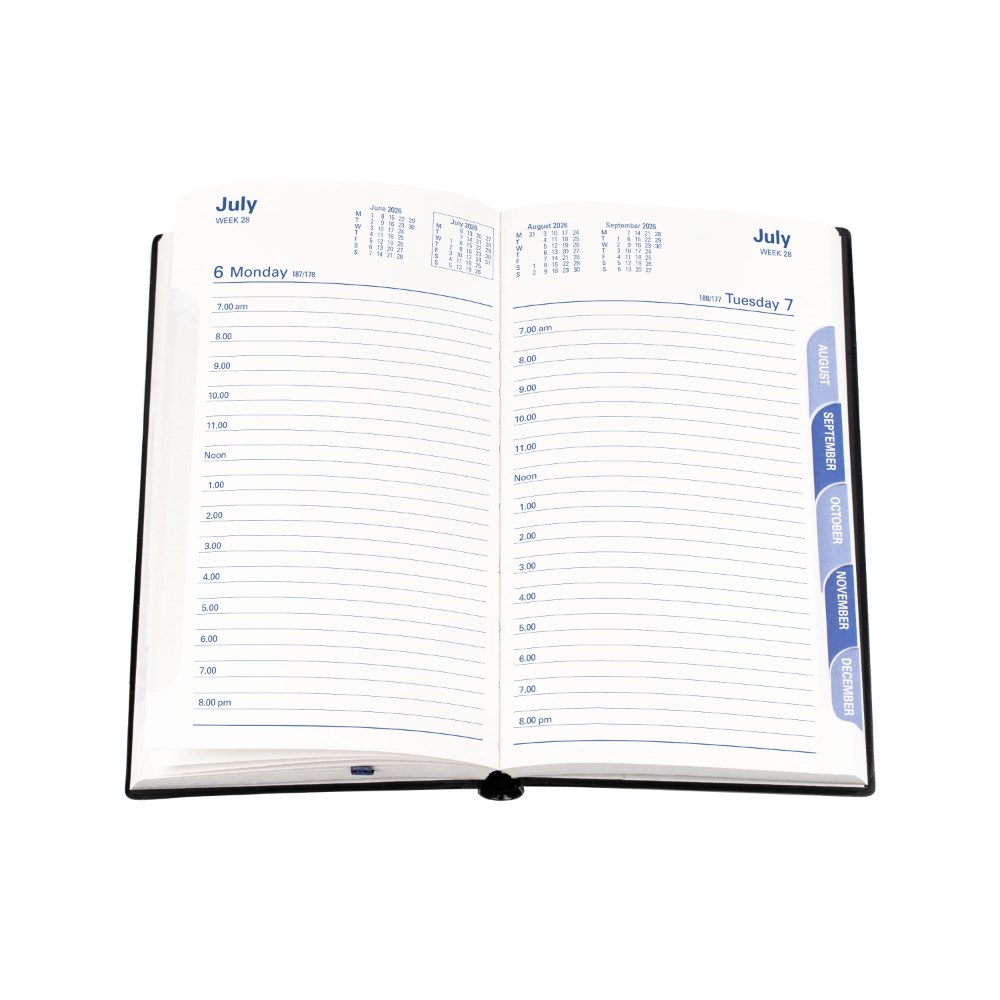 Bound in a highly durable, welded PVC padded cover. Printed on white paper, week numbers and Julian days.