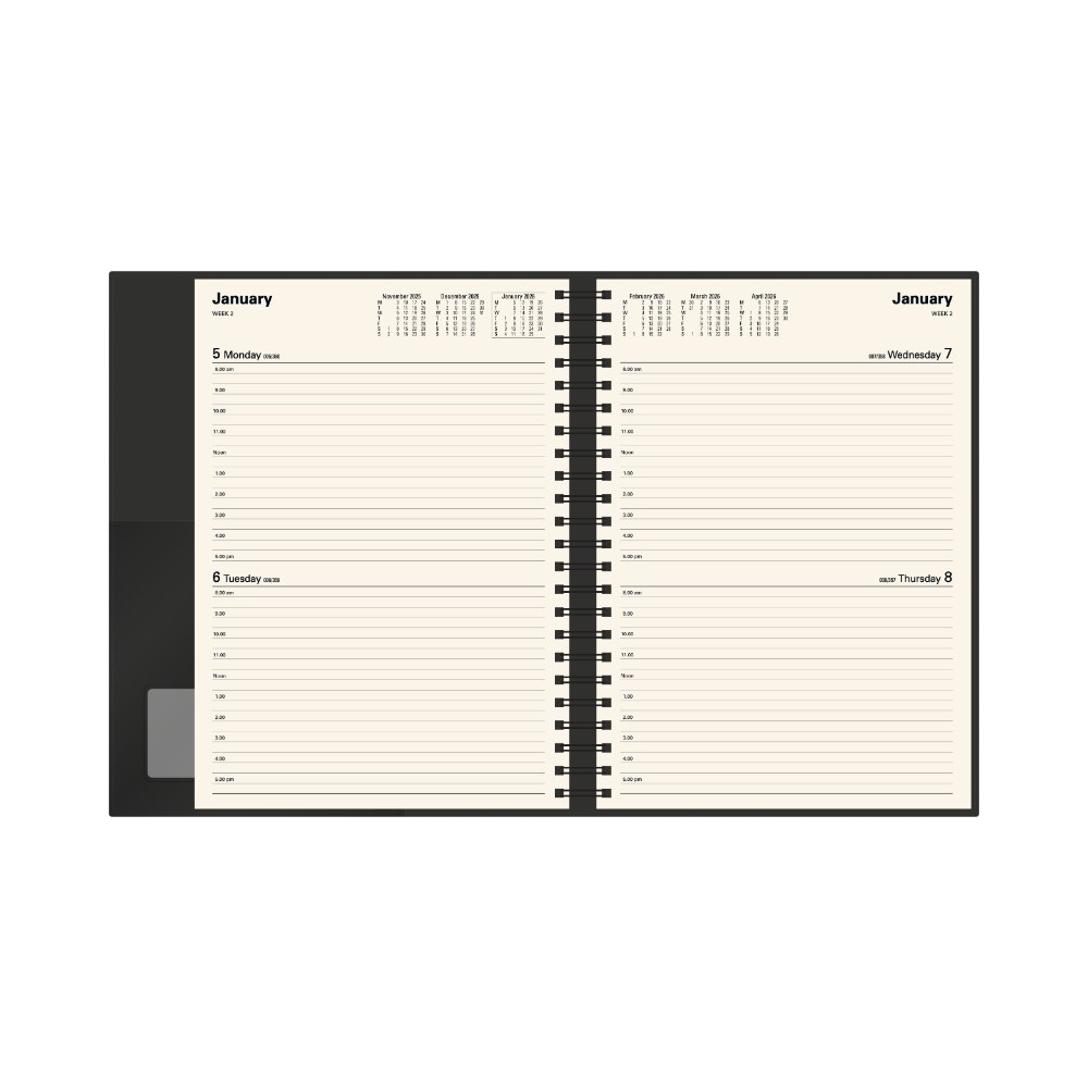 Printed on a subtle cream paper, each dated page layout features a six-month to opening calendar, week numbers, Julian days, as well as both national and international public holidays.