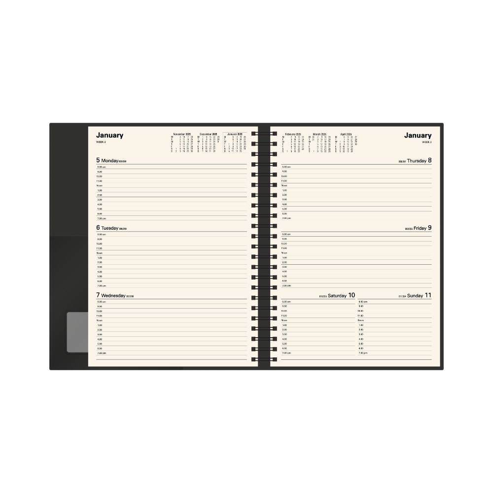 Printed on a subtle cream paper, each dated page layout features a six-month to opening calendar, week numbers, Julian days, as well as both national and international public holidays.