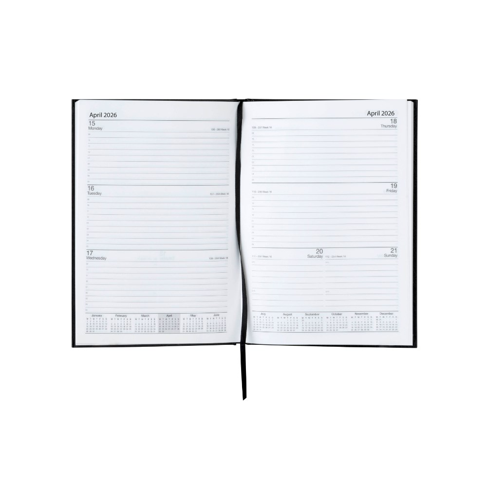 Includes a ribbon bookmarker to mark significant dates, events, or entries within the diary.