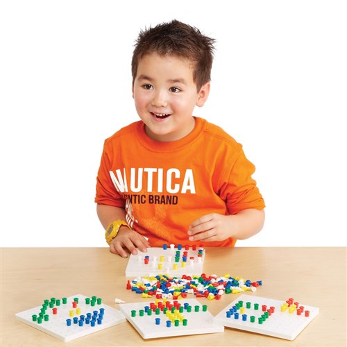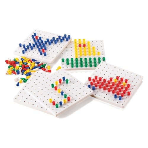 Set includes 1000 pegs and 5 white peg boards in a set. Each peg board measures 16cm square.