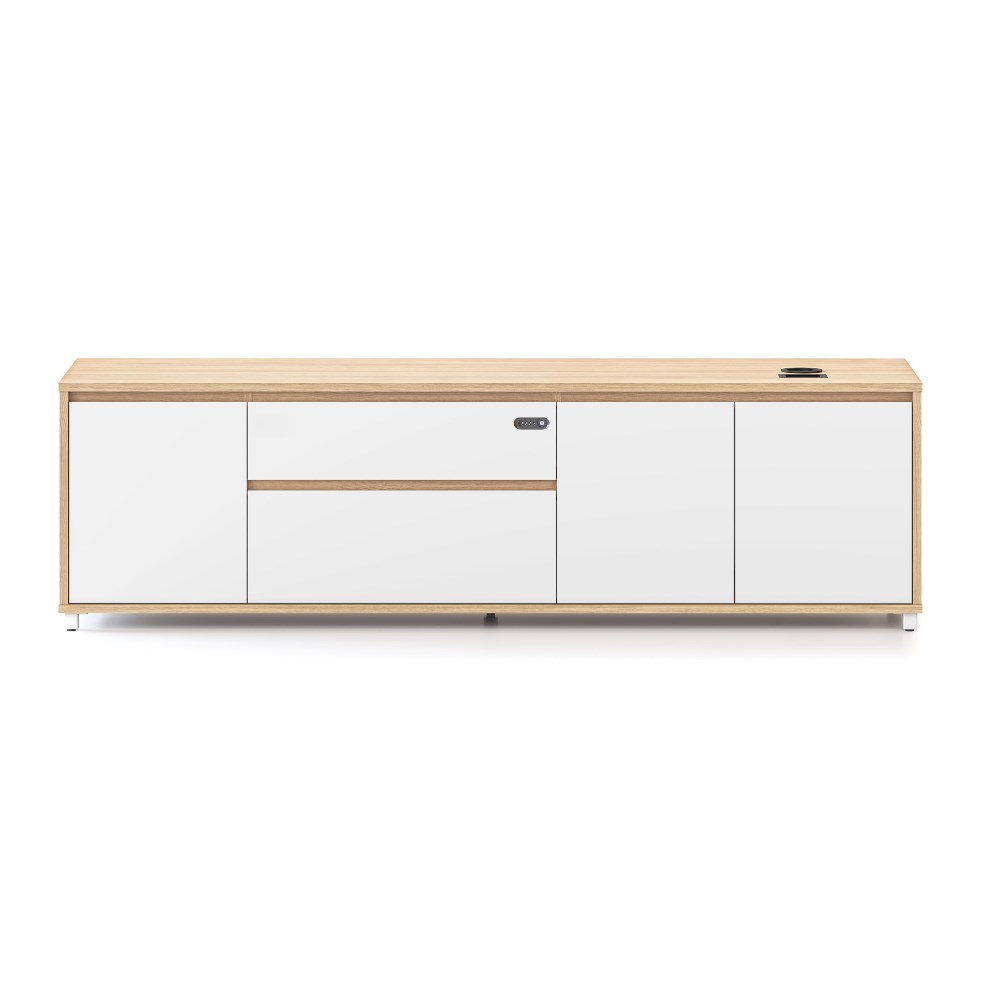Executive desk left hand side cabinet for Executive Boost+ and Halo+ Workstations. Natural Oak carcass and Natural White drawer and door fronts.