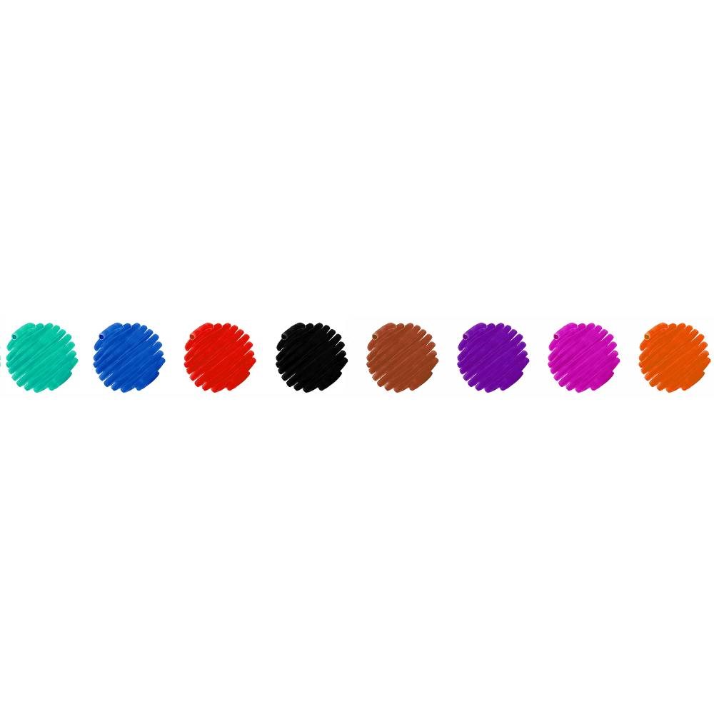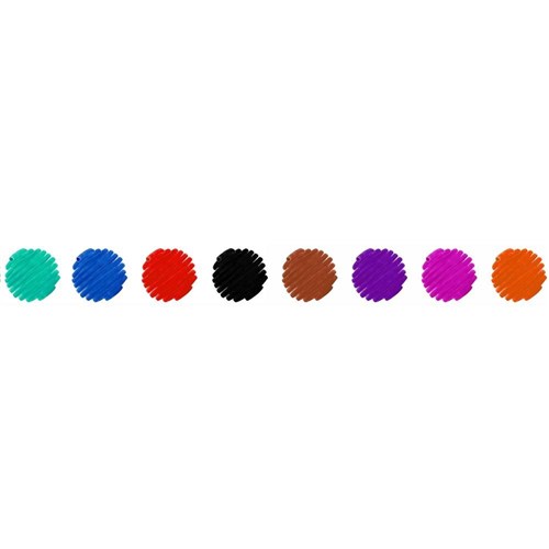 8 bright, vibrant colours in Red, Pink, Orange, Green, Blue, Violet, Brown and Black