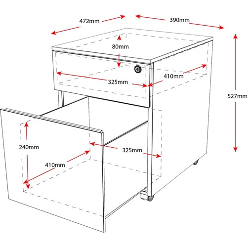 527mm H x 390mm W x 472mm D mobile pedestal.