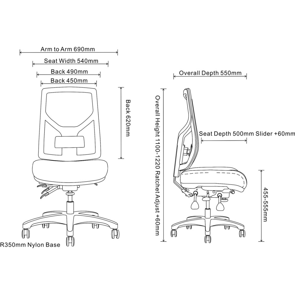 Seat Width: 540mm. Seat Depth: 500-560mm. Back Height: 620mm. Back Width: 450-490mm. Seat Height Floor To Seat: 455-555mm.