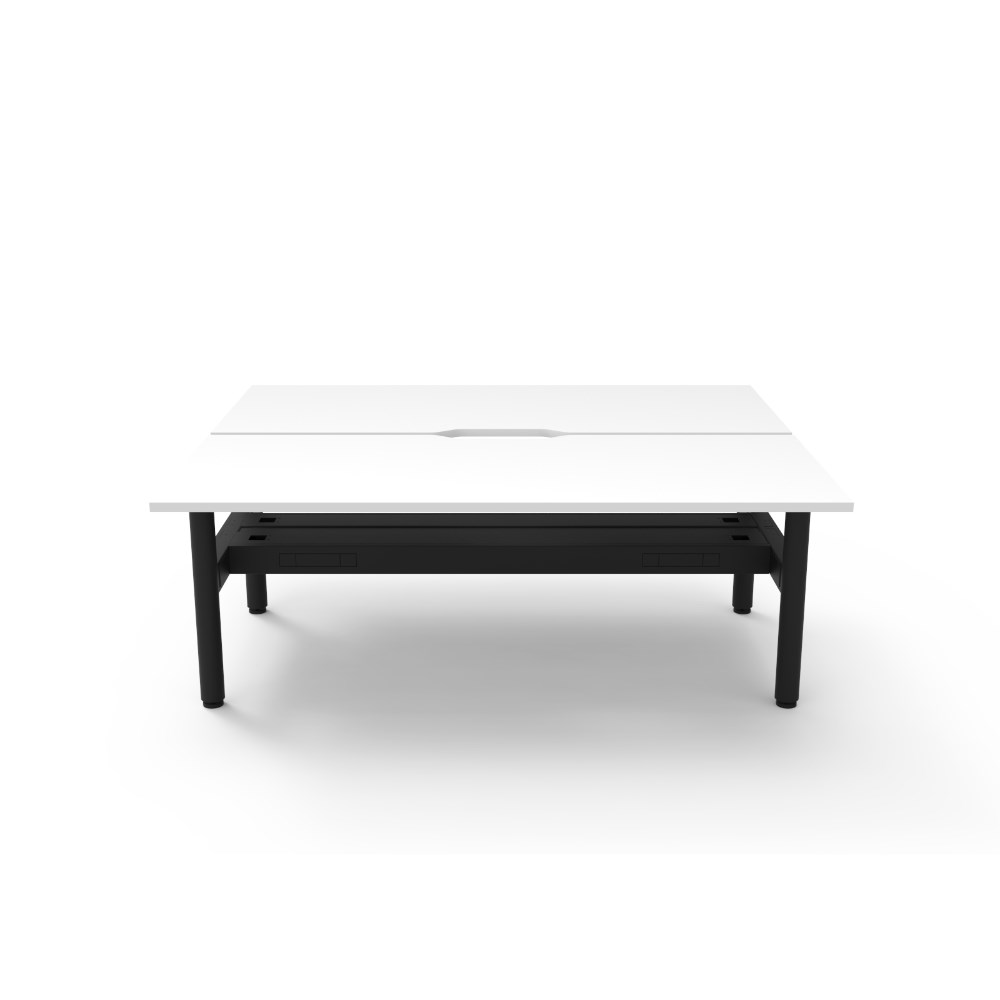 Natural White top Black Satin frame. Double sided workstation with cable tray.