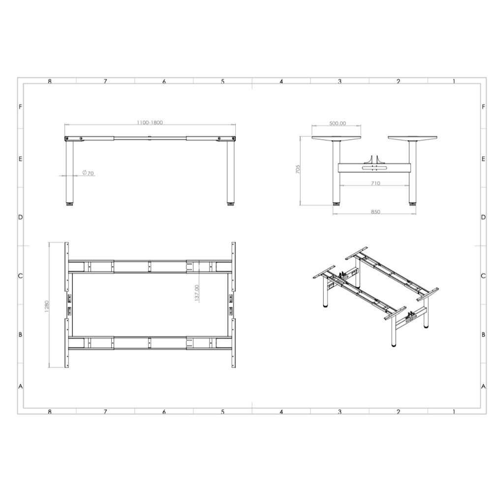 The telescopic frame allows for flexible configurations between 1100mm and 1800mm wide, accommodating various team sizes and layouts. Finished in a durable powder coat, this frame offers a professional and modern aesthetic.