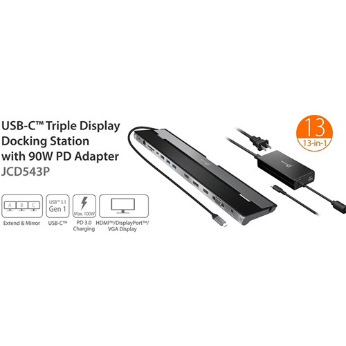 J5Create JCD543P USB-C Triple Display Docking Station with 100W Power Delivery Adapter