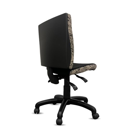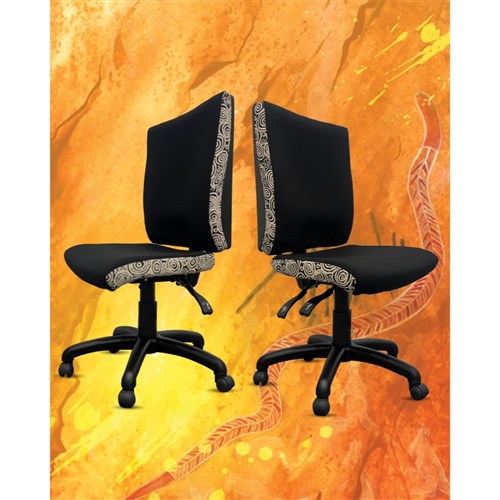 A unique commercial fabrics designed by Nelly Patterson (Indigenous Artist) combined with K2 Black Fabric to upholster the chair.