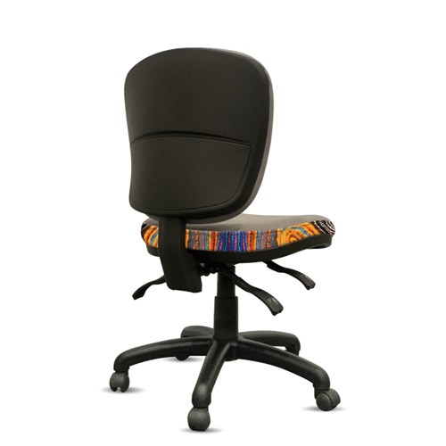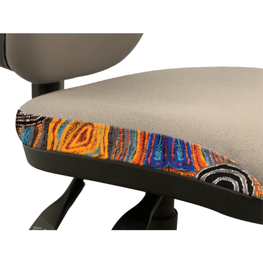 A unique commercial fabrics designed by Mary Napangardi Brown (Indigenous artist) combined with K2 Mist Grey Fabric to upholster the chair.