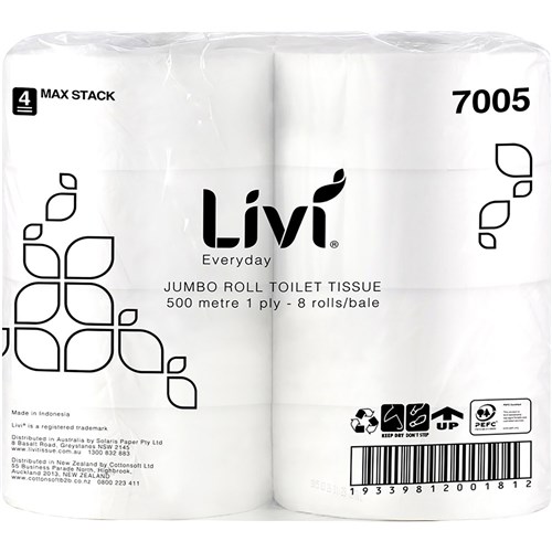 Livi Basics Toilet Paper Rolls 1 Ply Jumbo Roll 500m Box 8