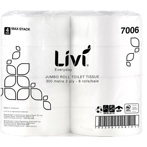 Livi Basics Toilet Paper Rolls 2 Ply Jumbo Roll 300m Box 8