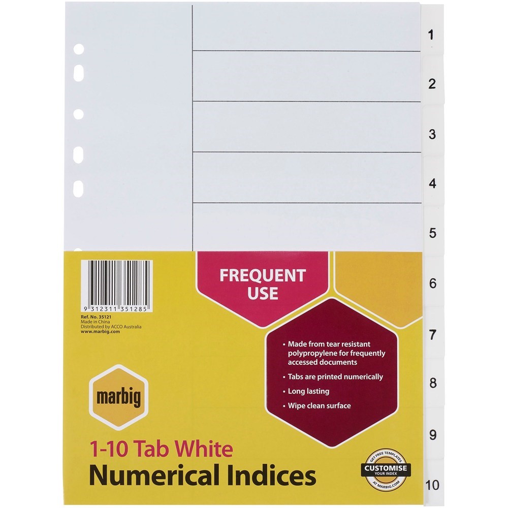 Marbig Plastic Divider A4 Indices 1-10 White