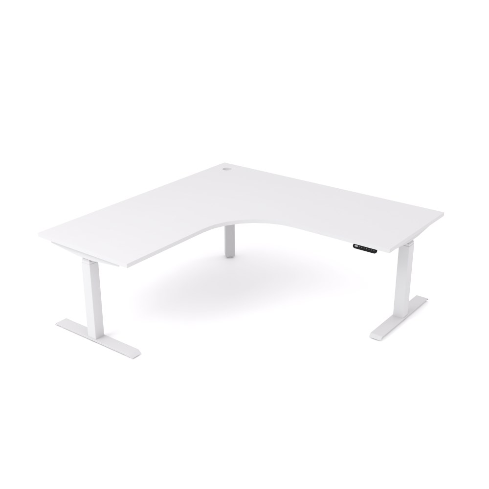 Height adjustable 90 degree workstation left hand return White frame White top.