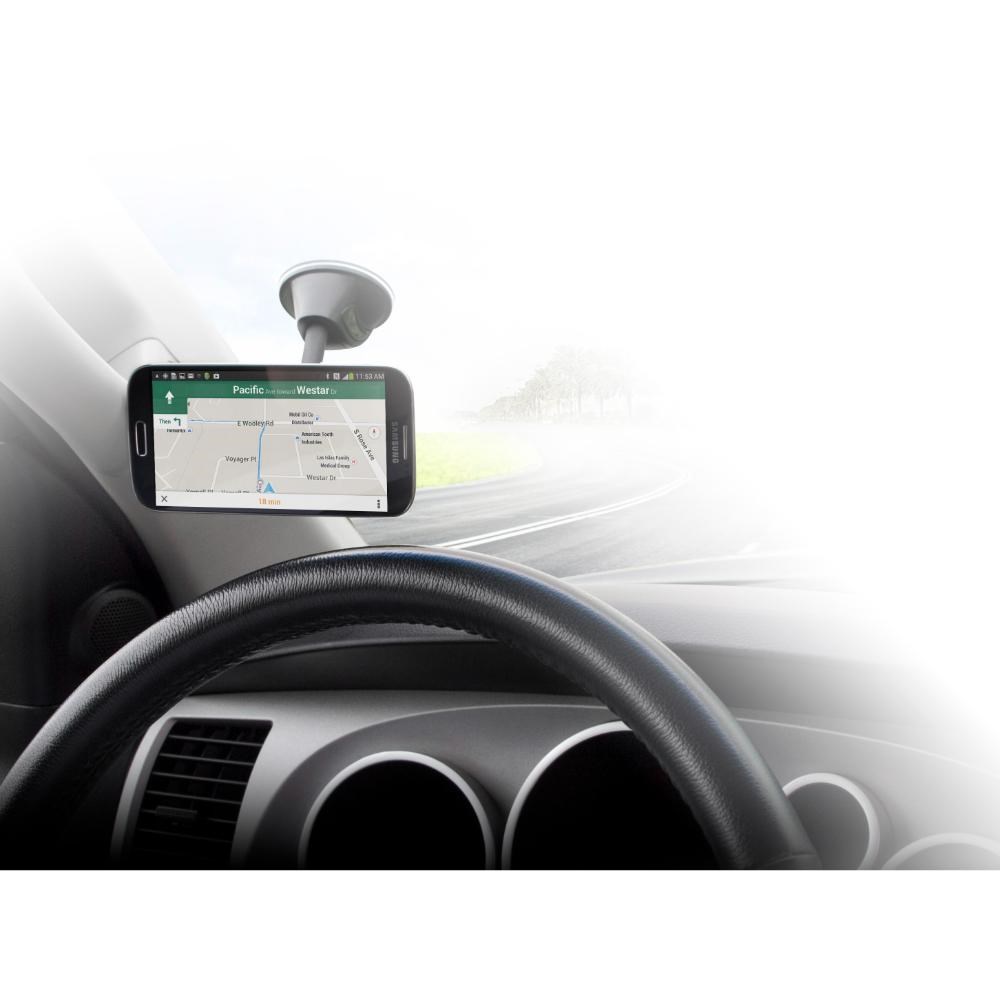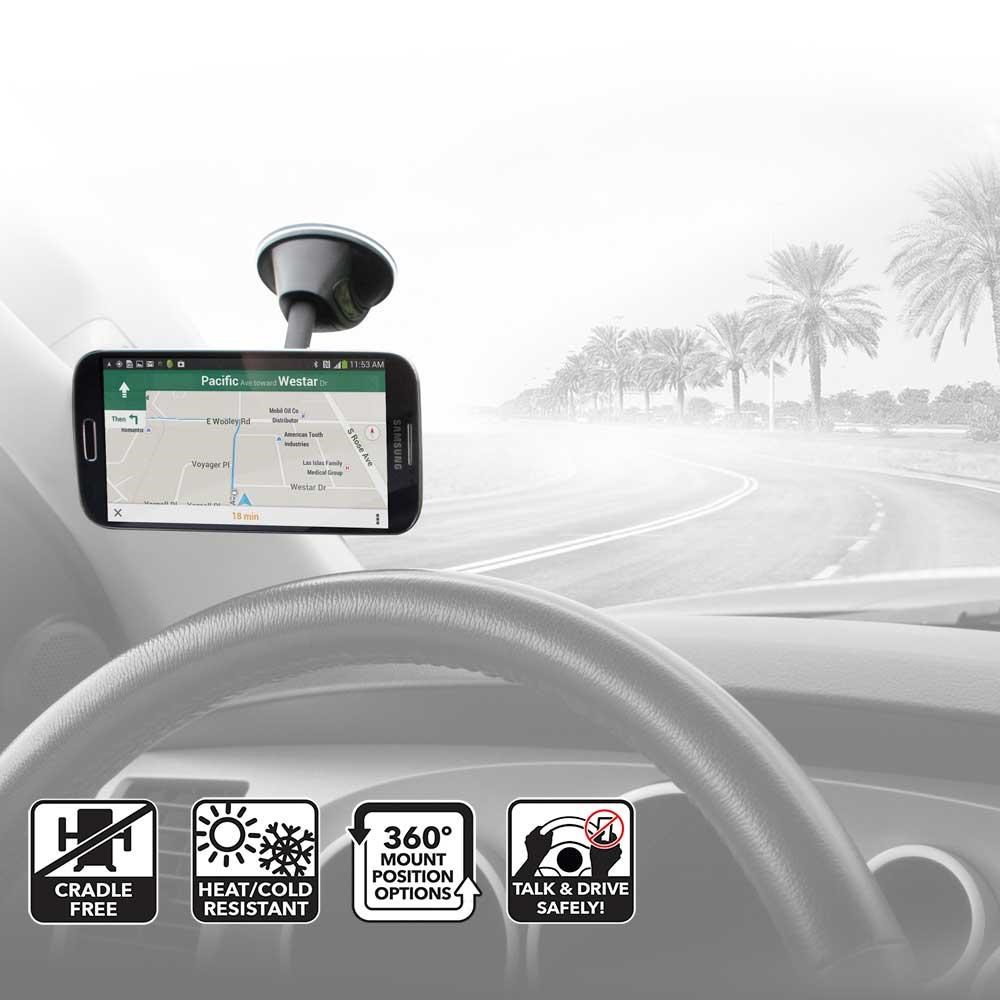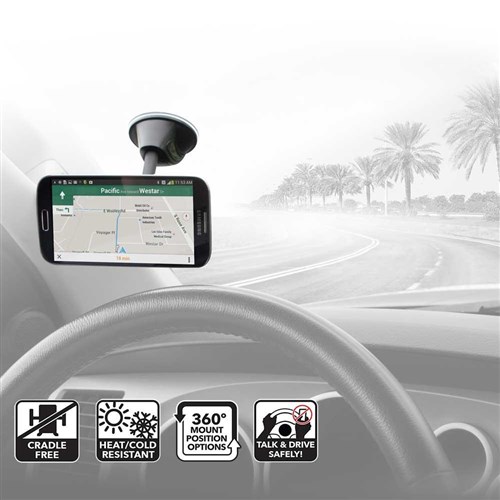 StickGrip material on suction cup mount base plus automotive-grade adhesive mounting disk provides a strong, secure hold on dashboards, windows, countertops, desks, tables and other surfaces.