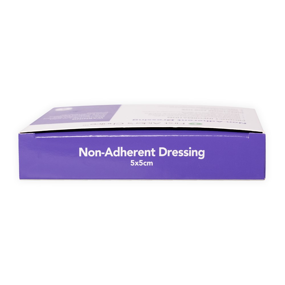 Non-stick dressing minimises adherence to wound.