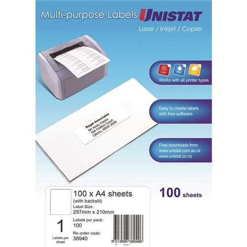 Unistat Laser Multi Purpose Labels 297x210mm Back Slit White 1UP, 100 sheet