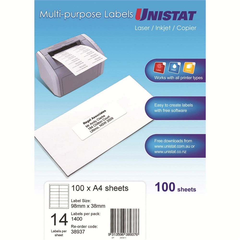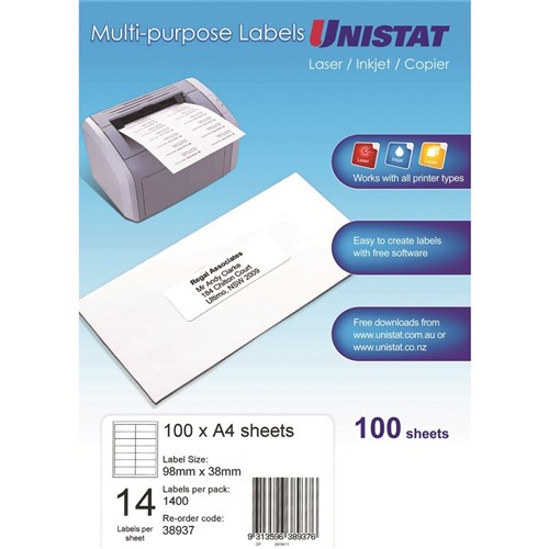 Unistat Laser Multi Purpose Labels 98x38mm White 14 UP, 100 sheet